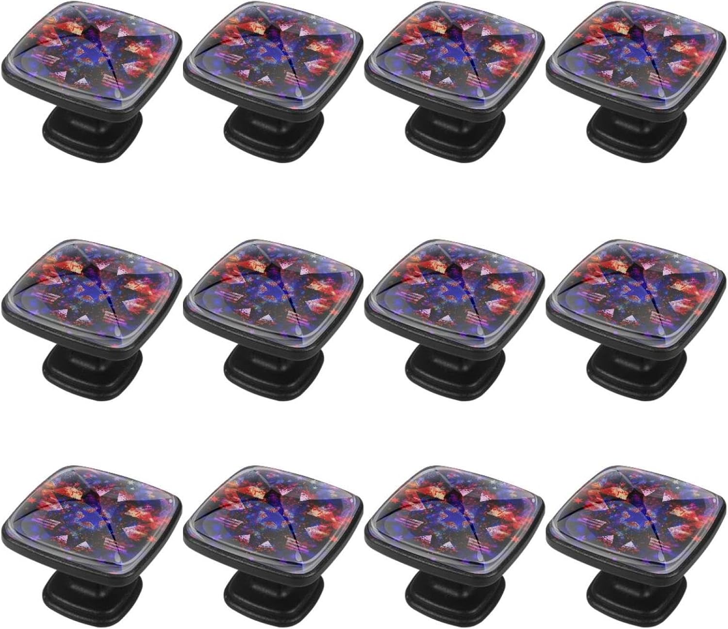 Make your home a sparkly new look with the help of our unique cabinets knobs!Our pull handles provide an easy but unique way to renew your furniture, keeping your home furniture always being stylish and modern.Product Introduction:1. Material: Crystal glass + black ABS handle, long-lasting hardware.2. Shape: Square mushroom design, looks cute and easily match any home furniture.3. Size: 1.18x0.82x0.78 in/3x2.1x2 cm. Two lengths of screws are available for you. Short 0.8x2.8CM/0.31x1.1IN, Long 0.8x3.5 cm/0.31x1.37 IN. You can choose the appropriate length according to the thickness of the furniture.4. Decorative Appearance: No matter you like cute, funny or art patterns, our store ensure that everyone can find his/her favorite drawer knobs.ApplicationOur drawers knobs are ideal for drawers, closets, cabinets, dressers, bookcases, jewelry boxes, wardrobes, cupboard, etc., help you easily open and close drawers. It can be used in many places, such as kitchen, bedroom, bathroom, living room, nursery, etc.Package Included12 X Drawer Knobs Handles, 24 X Stainless Steel Screws (12 short+12 long), and the pulls are easy to install, just remove the crystal glass drawer handle, put the screws through the furniture to be installed and tighten them.