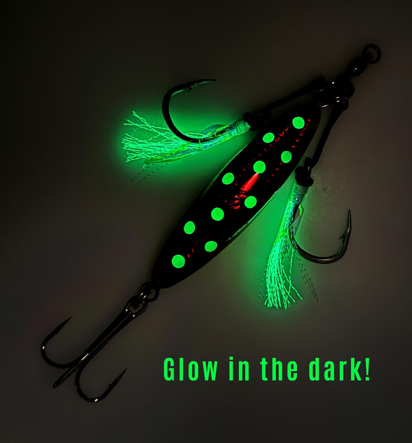 The Eddie Bomb 16oz Tuna Jigs in Crimson Red Polka Dot (2 pieces) are specially designed to target bluefin tuna, featuring a slow fall rate and erratic flutter action that attract large predator fish from deep-water depths. Crafted from high-quality, corrosion-resistant materials, these heavy jigs are built to withstand the harshest conditions of saltwater fishing, ensuring long-lasting durability. Equipped with Glow Bomb Technology, the holographic finish enhances visibility in low-light conditions, while the bold Crimson Red Polka Dot pattern ensures high contrast, making it irresistible to fish. The jigs are constructed with a wire-through design for maximum strength and resilience, able to handle aggressive fish like bluefin tuna. With versatile rigging options, the pack includes 1 rigged and 1 unrigged jig, providing anglers with flexible fishing techniques, whether using assist hooks or fishing them unrigged. Suitable for both beginner and professional anglers, the Eddie Bomb jigs' proven reputation in consistently attracting and catching bluefin tuna makes them a must-have for any angler's tuna fishing gear, tuna tackle, and flat fall jigs tuna collection.