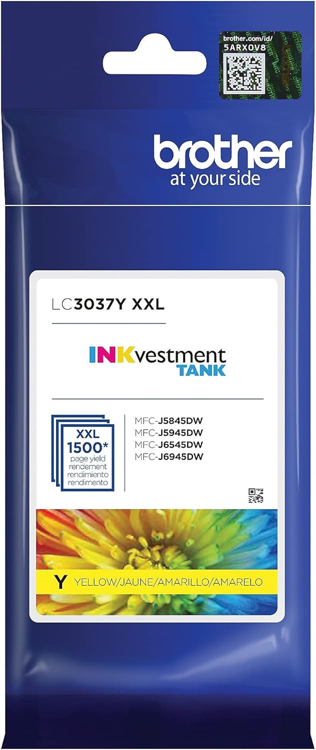 Brother Genuine LC30373PKS 3-Pack Super High-yield Color INKvestment Tank Ink Cartridges includes 1 cartridge each of Cyan, Magenta and Yellow to deliver consistent, rich, vivid professional inkjet print quality with an up to 1,500-page yield/cartridge.(1) Brother Genuine ink is intelligently engineered to work with your Brother inkjet printer for optimum results delivering superior high-quality results that withstand the test of time.Brother Genuine ink helps ensure reliable operation and protection of your inkjet printer and its long-life print heads and extensive testing ensures optimum performance. Using non-Brother Genuine inks may result in reduced page yield, inferior image quality and a messy experience. Brother Genuine ink is designed and formulated to work with Brother inkjet printers for optimal results. Use only Brother Genuine ink for reliable results. Product warranty may not cover damage or malfunction caused by using non-Brother ink cartridges.Brother Genuine ink cartridges come in a variety of page yields to help save money and deliver more pages. Choices for INKvestment Tank inkjet printer include Super High-yield and Ultra High-yield options. Always check compatibility of the ink cartridge with the Brother inkjet printer model.Brother offers an environmentally responsible way to dispose of Brother Genuine cartridges at end of life. Visit manufacturer’s website for more information.Use Brother Genuine LC-30373PKS 3-Pack Color Inkjet Cartridges with Brother INKvestment Tank printer models: MFCJ5845DW, MFCJ5845DW XL, MFCJ5945DW, MFCJ6545DW, MFCJ6545DW XL and MFCJ6945DW that feature Brother INKvestment Tank technology with exceptional features, internal ink tank for super convenience and large page yields. Brother INKvestment Tank models include a two-year limited warranty with free online, call, or live chat support for the life of the printer.(1) Approximate page yield in accordance with ISO/IEC 24711.