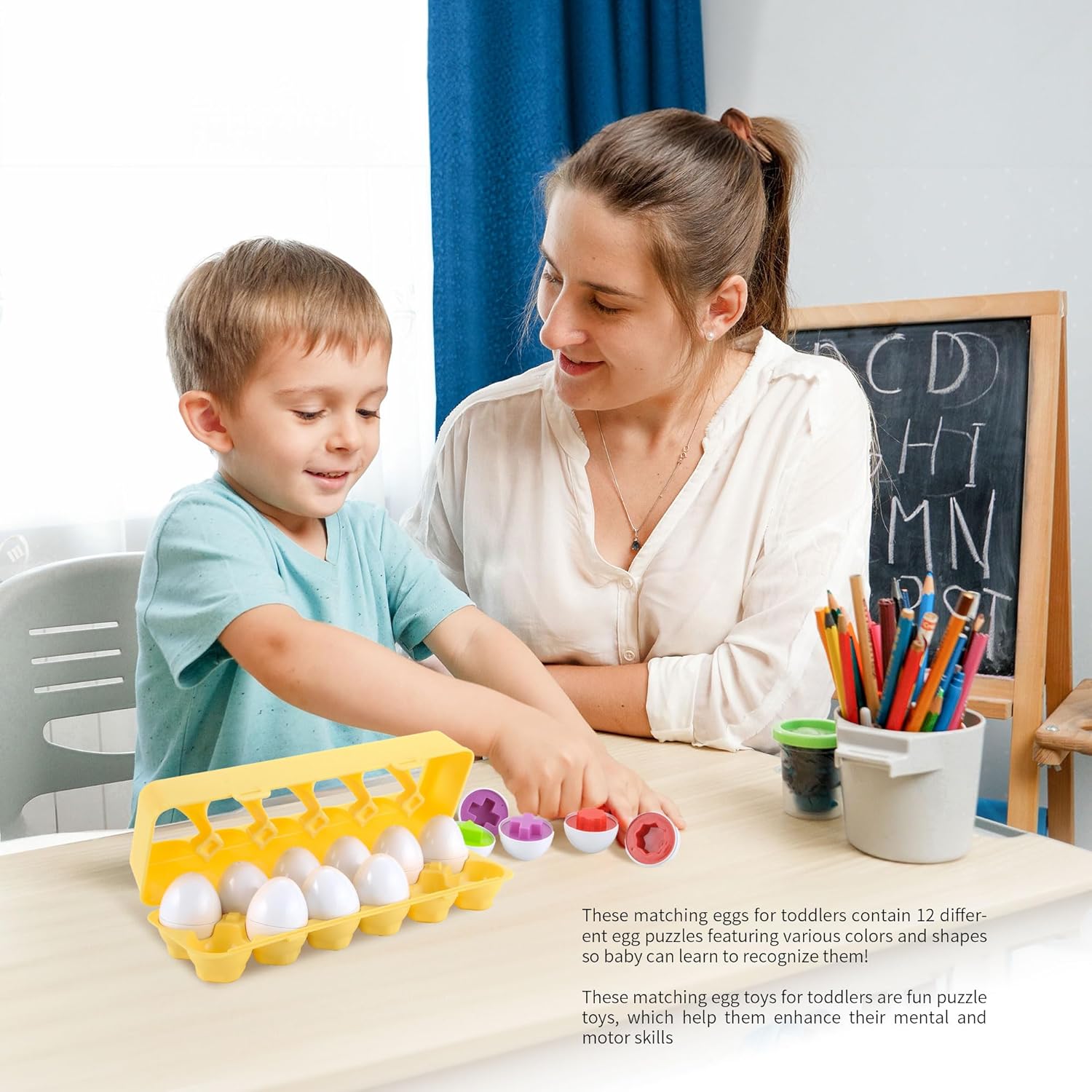 Introducing the Letters Matching Eggs Toys for Toddlers, a 26-piece set designed to make learning fun and interactive. Each egg opens to reveal a vibrant interior featuring one of five colorsโred, blue, yellow, orange, and greenโand is embossed with an uppercase letter. This engaging toy helps toddlers develop crucial early learning skills, such as alphabet recognition, color matching, and shape sorting. Inspired by Montessori principles, these eggs promote hands-on, independent play while enhancing fine motor skills through the act of grasping, twisting, and connecting the pieces. Made from durable, non-toxic materials, these eggs are built to withstand energetic play, ensuring long-lasting use. The set comes with a convenient carton measuring 11.6 x 9.8 x 2.8 inches for easy storage and organization. Perfect as a gift for birthdays, Easter, or any special occasion, these matching eggs provide endless combinations and hours of educational entertainment, making them a thoughtful and delightful addition to any child's toy collection.