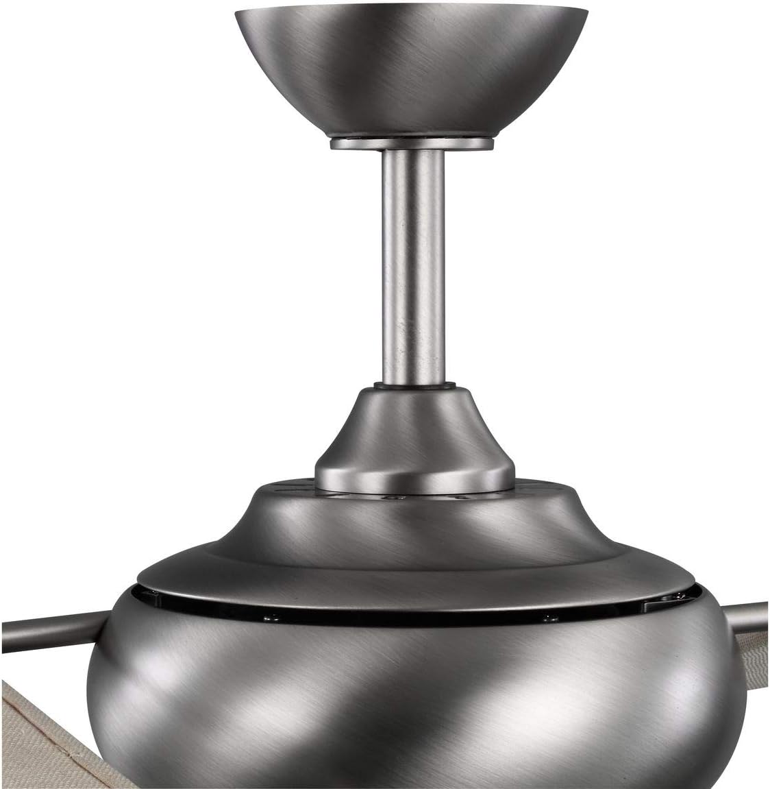 The Edisto 54 inch two-blade outdoor ceiling fan combines a sleek, contemporary style with high-quality performance. A wire frame supports canvas wrapped blades that feature UV inhibitors to protect the fabric from fading in the sunlight. Three fan speeds and a reversible switch keep individuals cool in the summer and warm in the winter. A white opal glass shade contains an 18W LED module light kit, offering energy efficient and cost savings benefits. Timeless Antique Nickel Finish with neutral Oatmeal Canvas Blades.