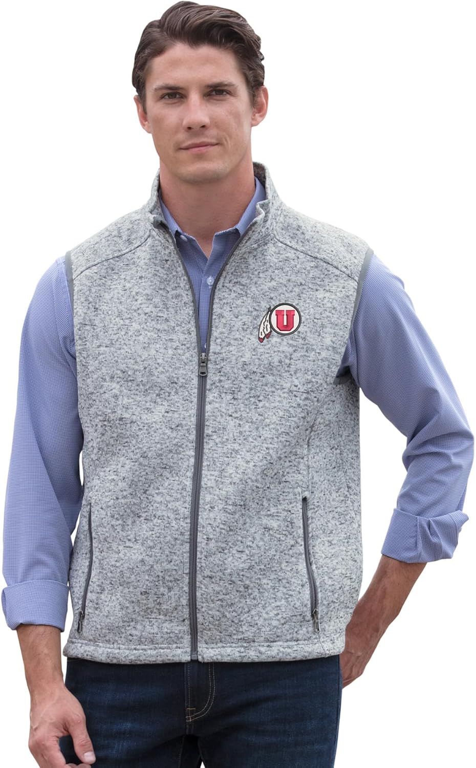 This Vantage Apparel sweater-fleece vest is a classic staple to any true fans wardrope. It is an essential layering piece that combines the style of a heathered swearer with the comfort of your favorite fleece.
