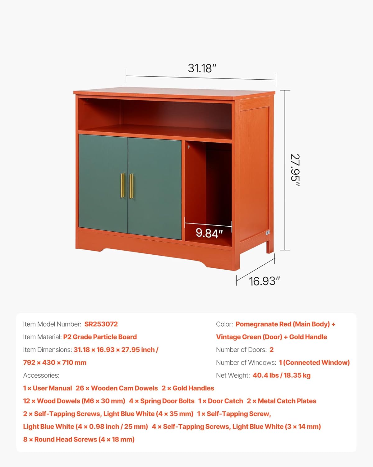 | Included Components | 1 × User Manual 22 × Wooden Cam Dowels 4 × Black Handles, 11 × Round Head Screws (4 × 18 mm) 2 × Door Stoppers 1 × Square Leg, 18 × Wood Dowels (M6 × 30 mm) 9 × M6 Metal Door Locks 2 × Door Catches 5 × Metal Catch Plates, 2 × Self-Tapping Screws, Light Blue White (4 × 30 mm) 10 × Self-Tapping Screws, Light Blue White (3 × 14 mm), 7 × Self-Tapping Screws, Light Blue White (4 × 35 mm) 14 × Self-Tapping Screws, Light Blue White (4 × 0.98 inch / 25 mm) |