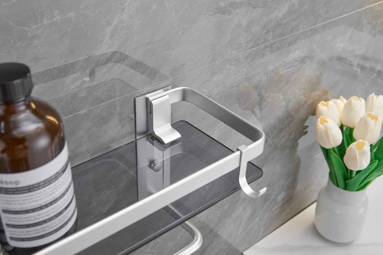 | Included Components | 1 glass shelf with towel bar, 1 glass floating shelf, 4 removable hooks, mounting hardware, glues for adhesive mounting, and installation instructions |